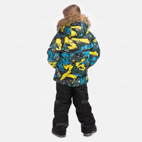 Bērnu jakas un bikšu komplekts. Ūdens un vēja necaurlaidīgs, gaisu caurlaidīgs virsējais audums. Jakai un biksēm ir mīksta odere. Piedurkņu un muguras daļā iestrādāta gumijas apdare. Noņemamā kapuce pie apkakles stiprināma ar velkro aizdari. Kapucei mākslīgās kažokādas malai. Biksēm ir augstais viduklis un regulējamas elastīgās lences. Jostas daļā iestrādāts gumijas paliktnis. Staras aizdarāmas ar stoperi. Ūdens necaurlaidīgi līmēti izšuvumi. Biksēm trūkst iekšējais staru apšuvums. Kā jakai, tā arī biksēm ir atstarojošas detaļas.