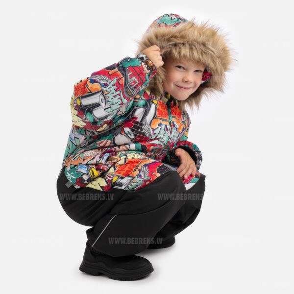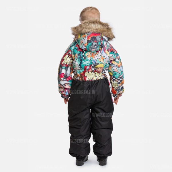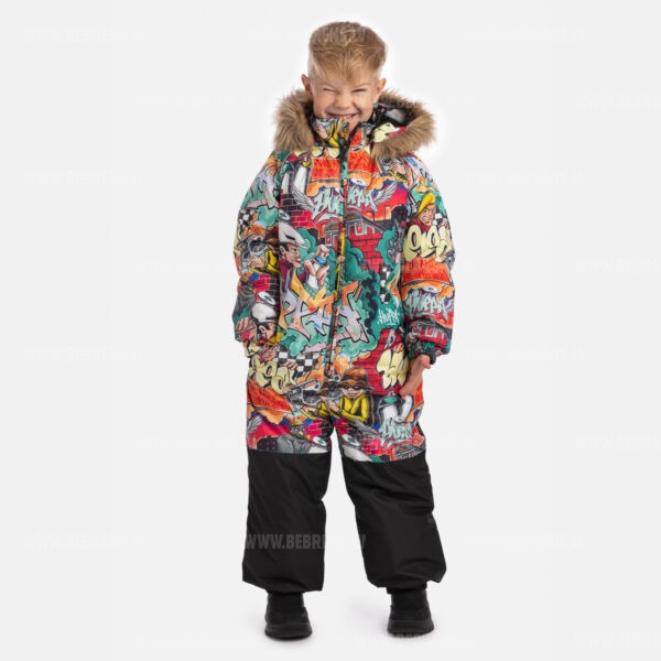 Bērnu ūdens un vēja necaurlaidīgs kombinezons. Gaisu caurlaidīgs virsējais audums. Kombinezonam mīksta odere. Piedurknēs un staru malās iestrādāta gumijas apdare. Noņemamā kapuce pie apkakles stiprināma ar velkro aizdari. Priekšpusē apšūtas kabatas. Ūdens necaurlaidīgi līmēti izšuvumi. Komplektā elastīgas pazolītes. Kapucei noņemama mākslīgās kažokādas mala. Auduma virspusē atstarojošas detaļas.